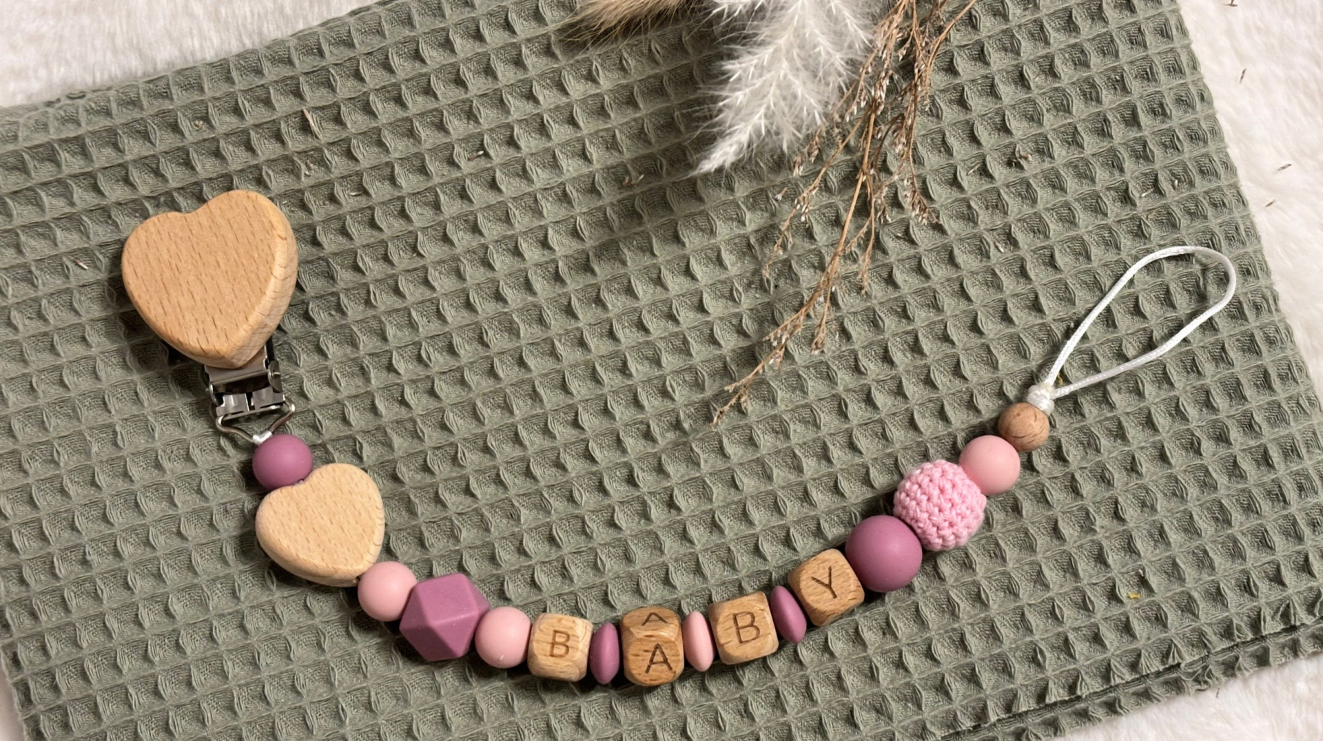 Wählbar zwischen Silikon Buchstaben (weiss/schwarz) oder Holzperlen (Natur) bitte ebenfalls mit der gewünschten Personalisierung angeben.