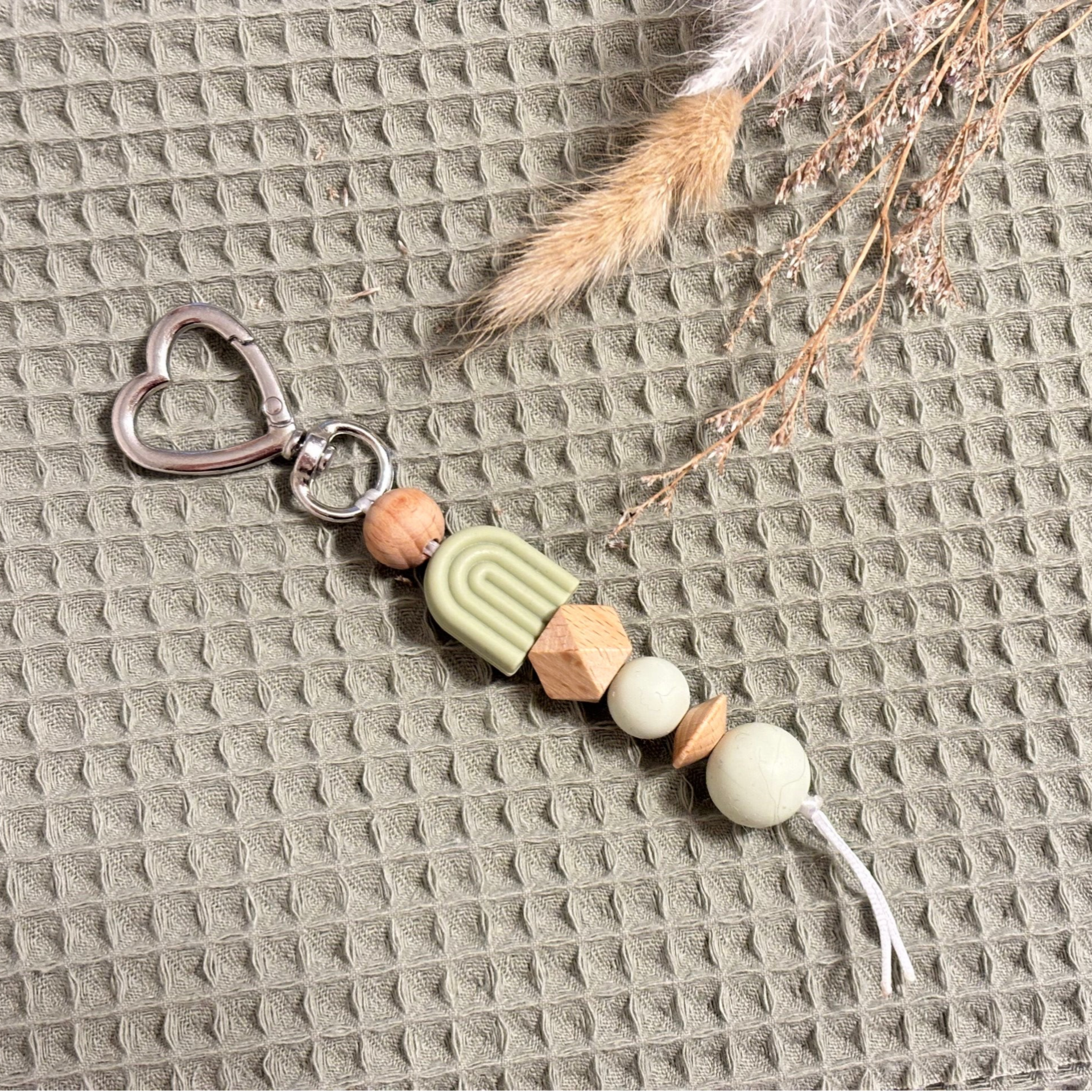Schlüssel/Rucksackanhänger aus Silikon und Naturholz,, regenbogen''